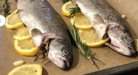 Die Forellen von innen und außen mit Salz und Pfeffer würzen und mit je 2 EL Olivenöl einreiben.