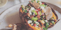 Gebackene Süßkartoffeln: Süßkartoffeln säubern und trocken tupfen. 1 EL Olivenöl mit einer Prise Salz verrühren und die Kartoffeln rundum einstreichen. Auf ein mit Backpapier belegtes Blech geben und auf mittlerer Schiene bei 180° C Heißluft ca. 1 Stunde backen.